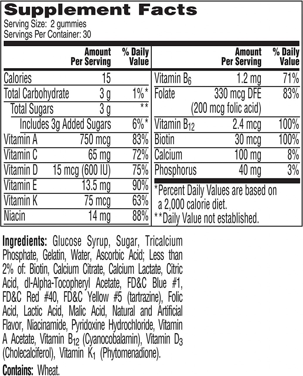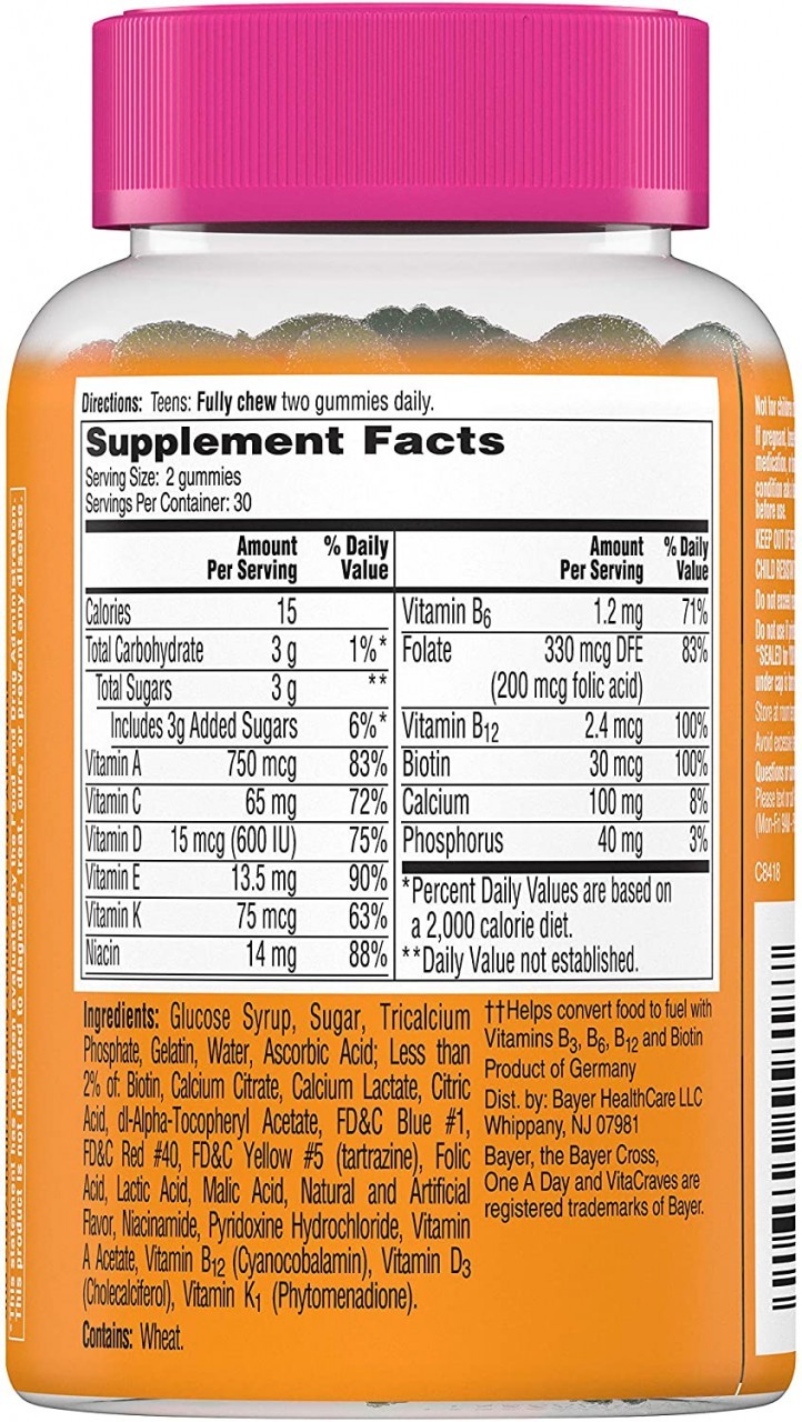 One A Day For Her VitaCraves Teen Multivitamin Gummies offer a wide variety of key vitamins and minerals. This easy to take gummy contains nutrients specially selected to support the overall health of teenage girls. This daily multivitamin contains Vitamins A, B6, B12, C, D, E, and K, Niacin, Folic Acid, Biotin, and Calcium. One A Day For Her VitaCraves Teen Multivitamin Gummies are formulated to support bone health, immune health, and physical energy by helping convert food to fuel.* Teenage girls should fully chew two gummies daily.