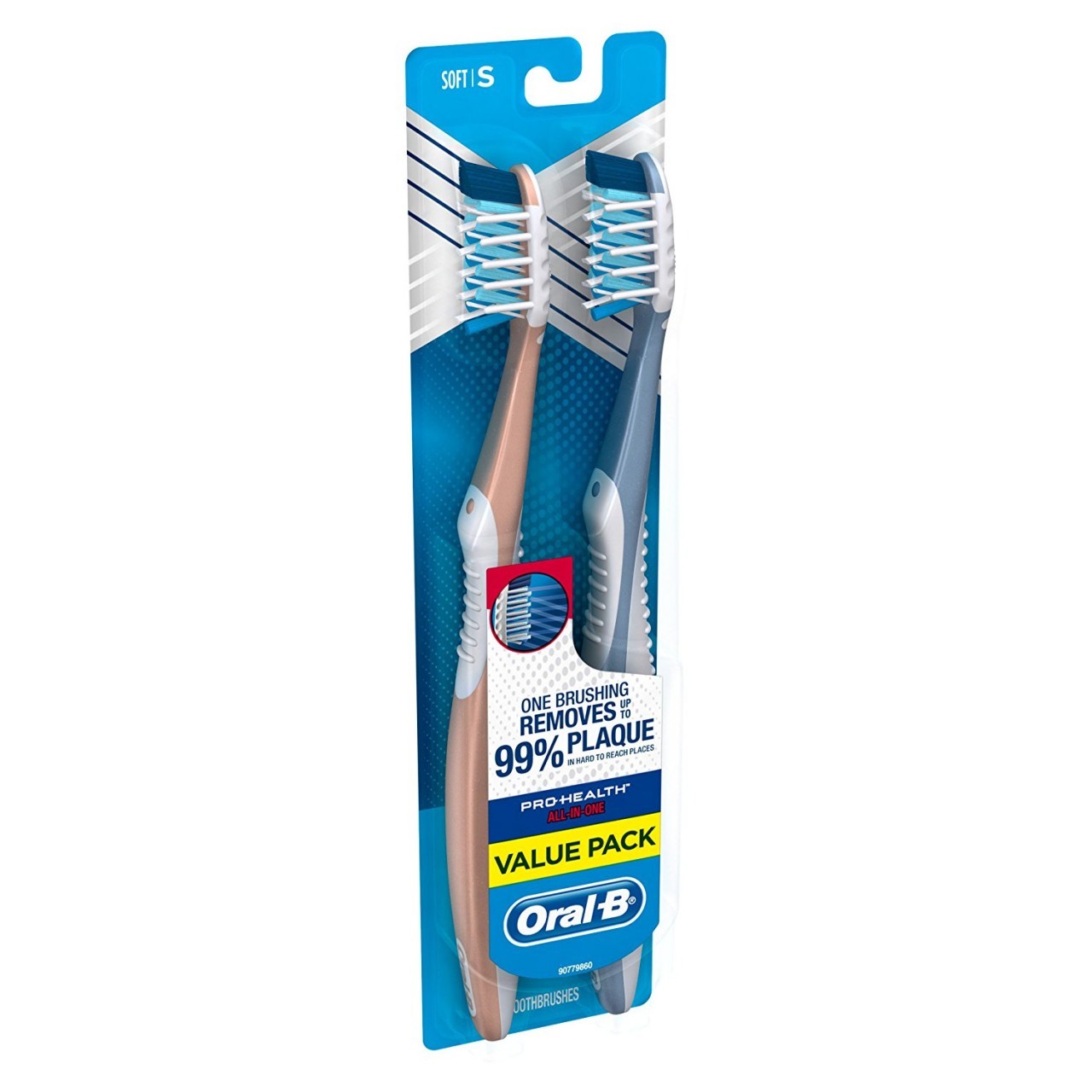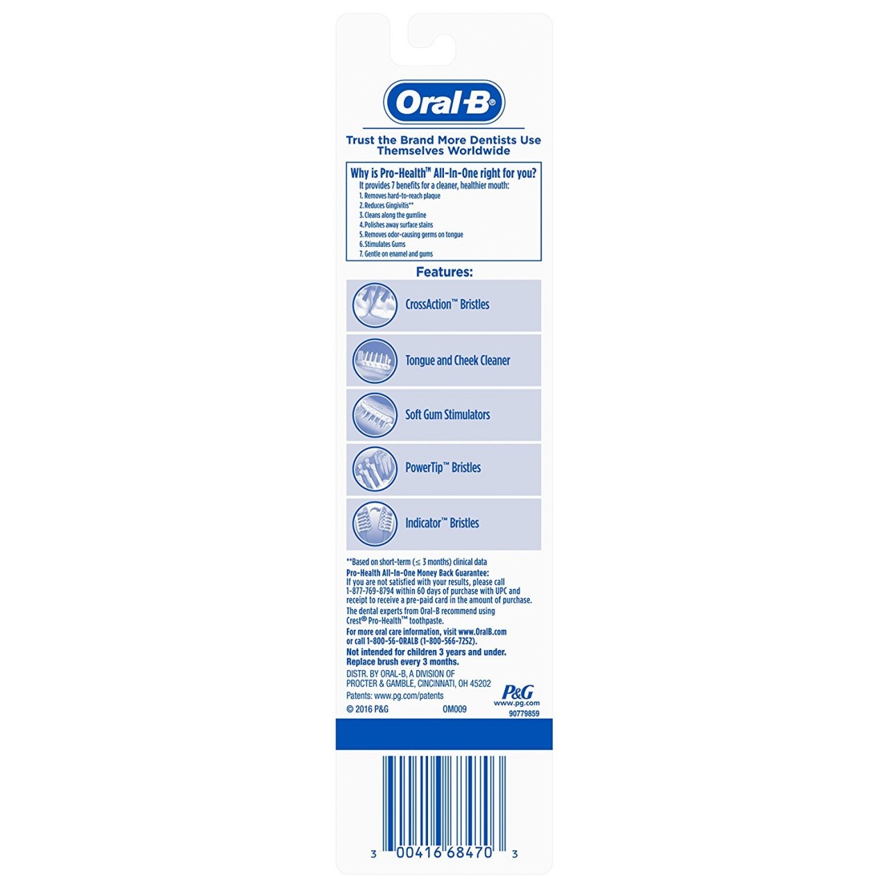 Oral-B Pro-Health All-In-One CrossAction Toothbrush bristles attack plaque from the perfect angle cleaning better than a flat trim brush with straight bristles. Plus, Pro-Health's tongue cleaner helps remove germs from the tongue.