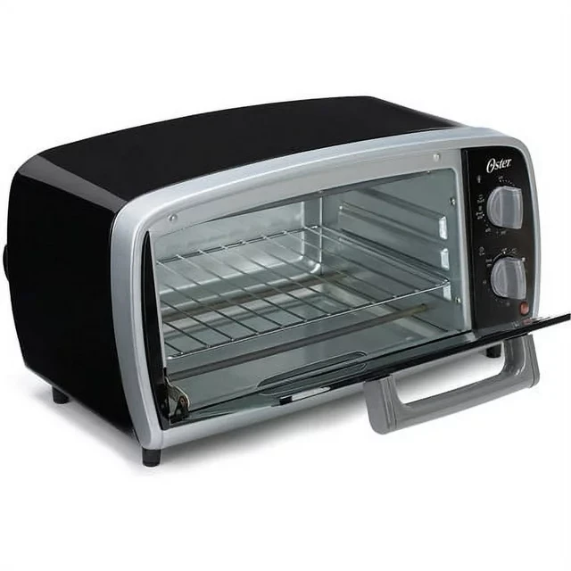 The Oster 4-Slice Toaster Oven offers an easy and convenient way to prepare meals and snacks. Compact enough to fit in most kitchen spaces, this toaster oven can be used for heating, baking and broiling with just a turn of the dial. The oven is designed to toast up to four slices at a time and uses manual controls. The dual dial controls let you set cooking time up to 30 minutes and cooking temperatures up to 450 degrees Fahrenheit. A power indicator illuminates when the toaster oven is turned on, and the baking rack is adjustable in two positions to accommodate a large variety of foods from pizzas to tall roasts. A removable crumb tray makes the unit easy to keep clean. This black toaster oven features stainless steel accents to complement most kitchens and dining areas.