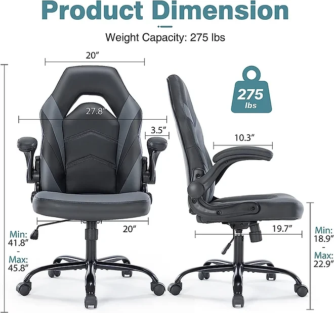 【Dimension】 - Size of back: 20 inch and 27.8inch. Size of seat: 19.7 inch and 20.5 inch. Seat adjustable height: 18.9 inch to 22.9 inch. Load capacity: 275 pound maximum weight. Recline function: Between 90 to 120 degree.