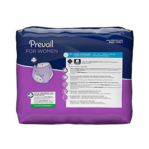 Prevail features the the Dri-Fit system which promotes skin health and helps reduce skin discomfort through a unique combination of cotton-enhanced* and synthetic fibers, which help keep you 5X drier than other leading brands.** Designed for maximum leakage protection, Prevail Underwear features Comfort-Shape Plus with gentle elastics that shape to your body for a more comfortable and discreet fit than standard adult diapers with the look and feel of everyday underwear. The cloth-like outer cover is soft and comfortable for all-day wear while ventilated waist panels allow air to pass through, reducing heat buildup and promoting healthy skin. Prevail Underwear is the #1 rated brand in the healthcare industry. Each product is constructed with a discreet core technology that allows for thinner, highly-absorbent material that enables the user to move more freely and confidently. Combined with a super absorbent polymer for dual protection, Odor Guard technology is proven to reduce the total amount of odor-causing ammonia formed during and after use. Moisture is quickly locked in upon contact for added leakage protection while the soft outer fabric provides additional all-day comfort. Large size fits waist sizes 38 to 50 inches for a snug and comfortable fit. Each Prevail incontinence product features a proprietary Quick Wick layer of material with MaxSoft Technology that provides advanced softness with rapid liquid absorption for optimal product performance. This package includes one pack with 18 pairs of disposable underwear. Prevail adult care products are manufactured in Pennsylvania with attention to quality, safety, sustainability, and responsible sourcing practices by First Quality, a family-owned company. First Quality is a leader in developing premium quality products. In addition to our collection of adult care products, we also offer lines of baby products, feminine care, paper products, and bottled water.Seal of Cotton and cotton enhanced TM are trademarks of Cotton Incorporated. The topsheet of this product contains minimum 15% cotton. **Based on the retention capacity of the leading bladder control pads brands.