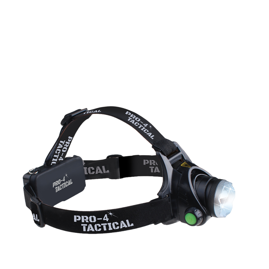 The Pro-4 Tactical Headlamp features a powerful light mounted on a comfortable head strap. To stay safe, you can adjust your light’s direction. This lightweight Pro-4 Tactical Headlamp fits around most hats and helmets. Zoom in and out in three light modes. Includes a Safety Light on the back.