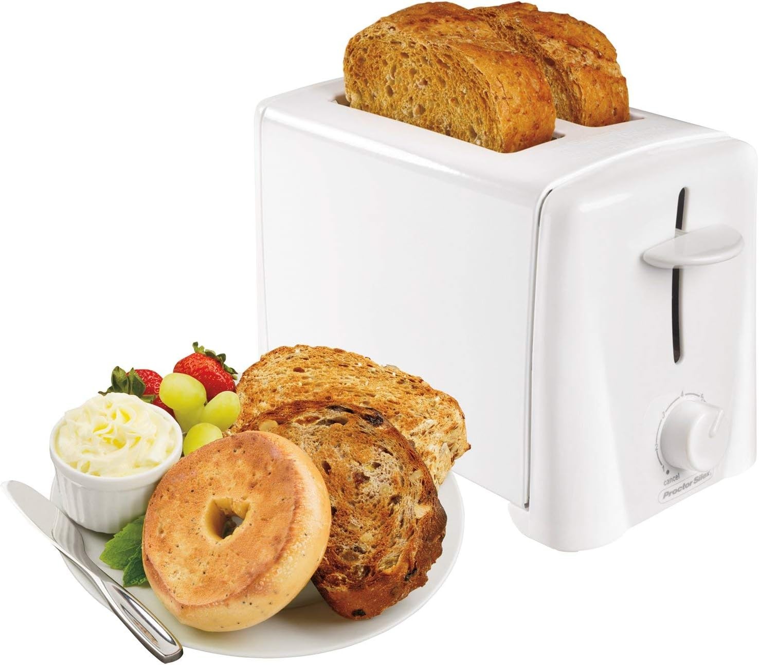 Proctor silex white 2 slice extra wide slot bagel smart toaster with auto shut off, extra wide slots, smarttoast thermostat, self adjusting bread guides, snap open crumb trays and full range shade selector.