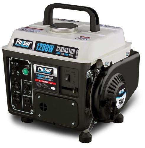 1200W Portable Generator, Pulsar. 900W running power. 69cc motor. 2 stroke. 1.1g fuel tank. 2x120v and 1x12v outlets. 17.1 length in x 16 width in x 15.4 height inches. Weight: 35lbs.