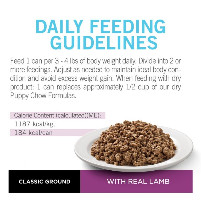 Feed 1 can per 3 - 4 lbs of body weight daily for puppies. Feed adult dogs about 1 can per 6.5 - 8.5 lbs of body weight daily. Divide into 2 or more feedings. Adjust as needed to maintain ideal body condition and avoid excess weight gain. When feeding with dry product: 1 can replaces approximately 1/2 cup of our dry Puppy Chow formulas.