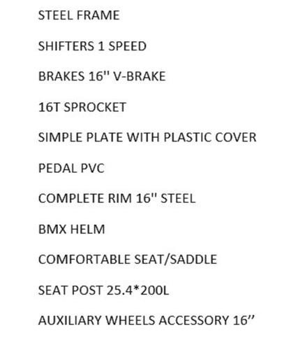 Propel your kids to days full of adventure with this bike with reinforced steel frame, steel frame, 1-speed gears, 16" v-brakes, 16t sprocket, single chainring with plastic cover, pvc pedal, 16'' full steel rim, bmx helmet, comfortable seat/saddle, 25,4*200l seat post, 16'' auxiliary wheel accessory. Cycling strengthens legs, contributes to healthy and balanced growth, develops balance, coordination and self-confidence. **Delivery restrictions apply. See terms and conditions for more details.