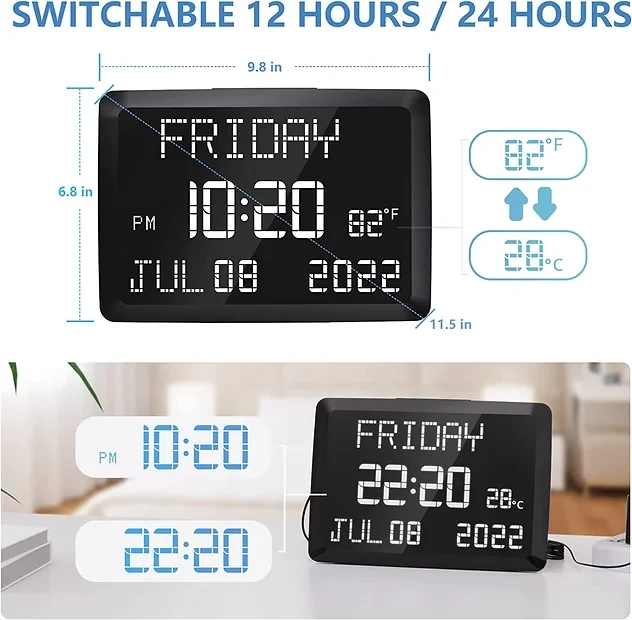 • 11.5" LED DISPLAY - The 11.5 inch large alarm clock with clear LED digital display makes it easy for the elderly to see the time.5 levels lights options for adjusting the brightness for those that are sensitive to light while sleeping.If you prefer to sleep in the dark, you can adjust this alarm clock's display to a minimum.