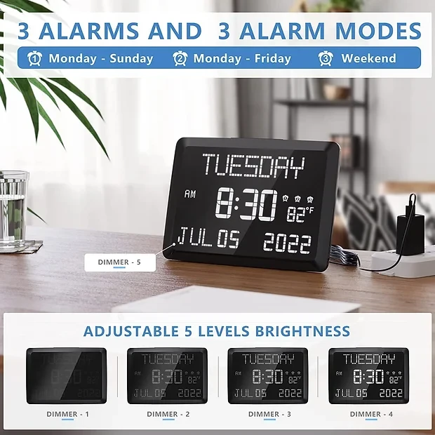 • MULTI-FUNCTION USE -The digital alarm clock is packed with a ton of different capabilities including indoor temperature,DST,2 USB charging port,3 different alarms and 5 adjustable diming.This alarm clock can display the date and the day of the week,easy-to-read LCD display.Adjustable dimming and brightness options allow you to find your own ideal display settings.