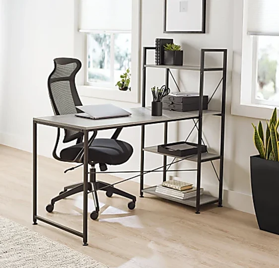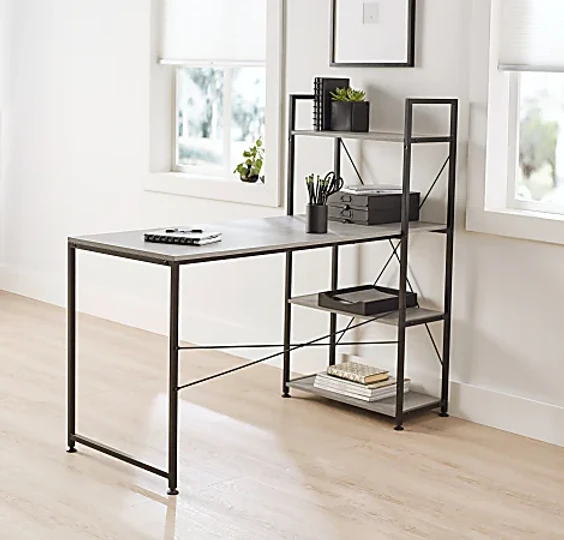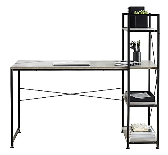 Organize your workspace with this Realspace Trazer desk. The metal frame provides solid support, while the paper laminate finish resists scratches and splashes for longevity. A removable shelf creates extra space for large files or items. This modern Realspace Trazer desk boasts 3 shelves to neatly store office accessories within reach, and the sturdy construction offers years of use in your office.