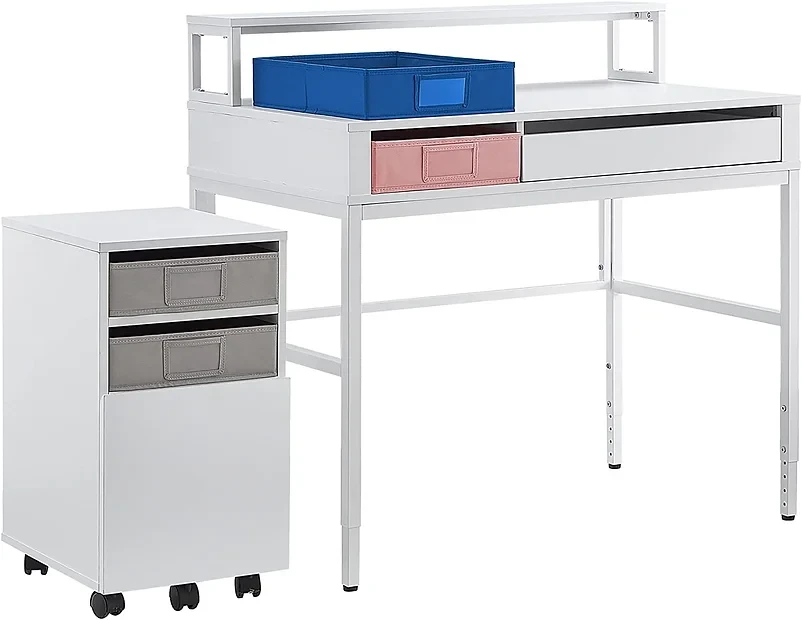 • Designed for compact spaces, this Realspace desk is ideal for young learners and comes with a mobile file cabinet with plenty of storage. The adjustable-height legs are designed to let the student desk grow with you. The Baywick desk with file cabinet set includes four non-woven fabric activity trays that hold supplies, accessories and specialty items. The trays are interchangeable and fit into the open cubbies in both the desk and the cabinet.