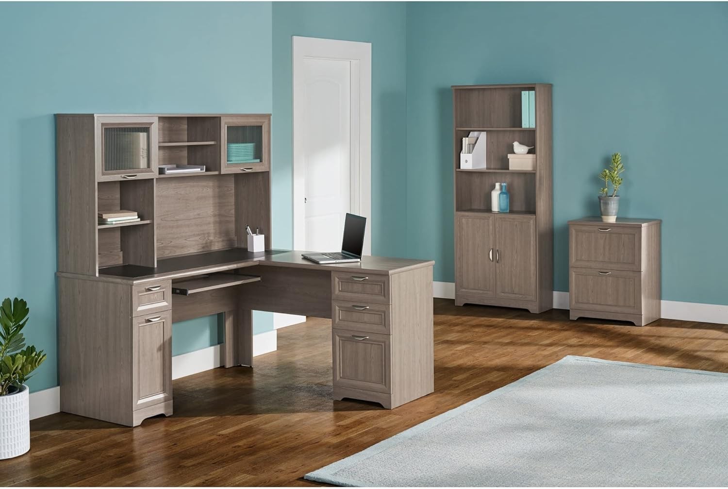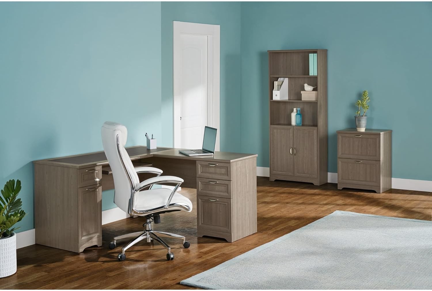 Carve out a space just for you with the Realspace Magellan Collection L-shaped desk as the anchor. Whether you work from home or an office, this corner desk is a great choice for professionals who need more room to get things done. There's plenty of room to multitask across the leatherette inlay on this office desk, and the storage options make it easy to keep your essentials, including your keyboard, out of the way, yet still within reach.