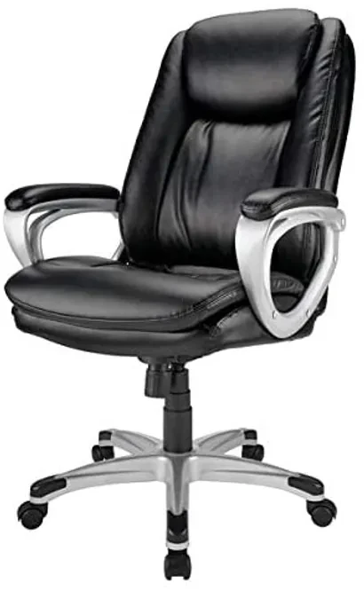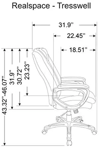 • Sit comfortably throughout the workday with this Realspace Treswell executive high-back chair. The bonded leather material delivers durability, while the color combination offers timeless appeal. Featuring a 5-star swivel base with built-in casters, this executive chair allows easy mobility and holds weights of up to 275 lbs. This Realspace Treswell executive high-back chair features a pneumatic handle for simple customization.