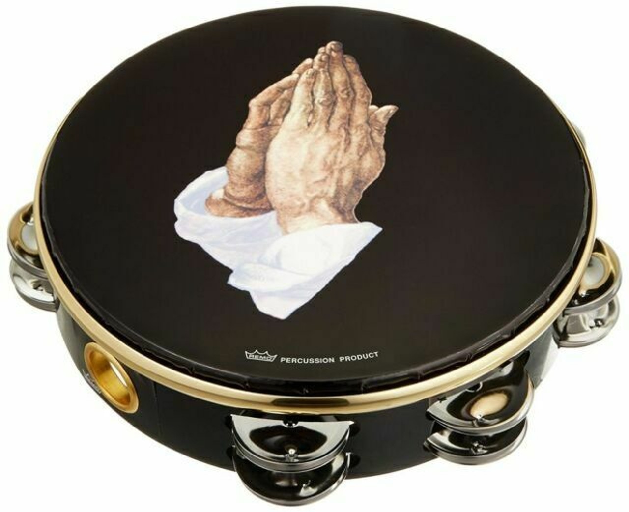 The Praise Tambourine features a bright open jingle tone for use in worship applications. Constructed with an Acousticon® shell and a pre-tuned graphic drumhead with a single-row 6 jingle set for the 6" model, and either a single or double-row 8 jingle set for the 8" and 10" models. The Praise Tambourine is lightweight and durable. Available in Religious Dove or Praying Hands graphics. Size: 6", 8" and 10".