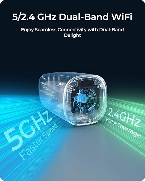2,4/5GHz WiFi Connectivity: This solar security camera supports 2.4 GHz and 5 GHz Dual-band WiFi, providing with choices among more stable connection from 2.4GHz WiFi and faster speed from 5GHz WiFi. Choose the suitable WiFi channel based on the camera's installation location for optimal performance.