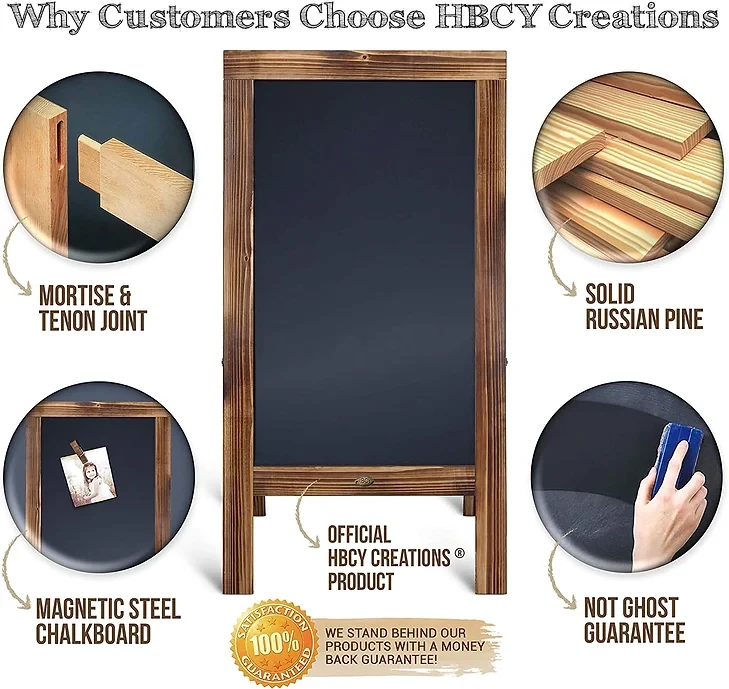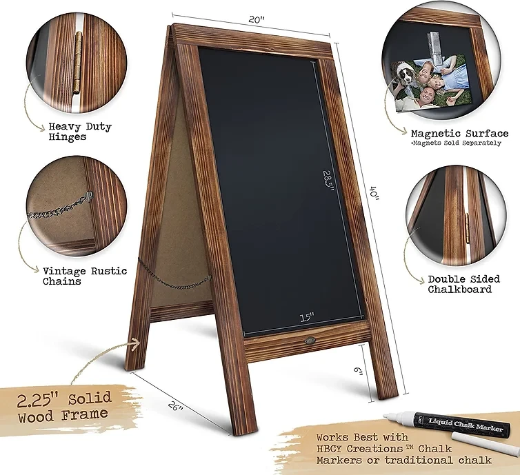 - RELIABLE STURDY DESIGN - Our solid design and construction enables our boards to withstand winds that others can't. heavy duty hinges help your A Frame last longer. The Double sided rustic chains enhance stability and authentic rustic style. Our high quality Russian pine wood makes our chalkboard signs sturdier and more durable.