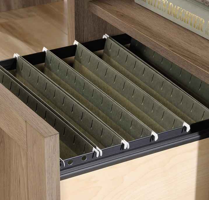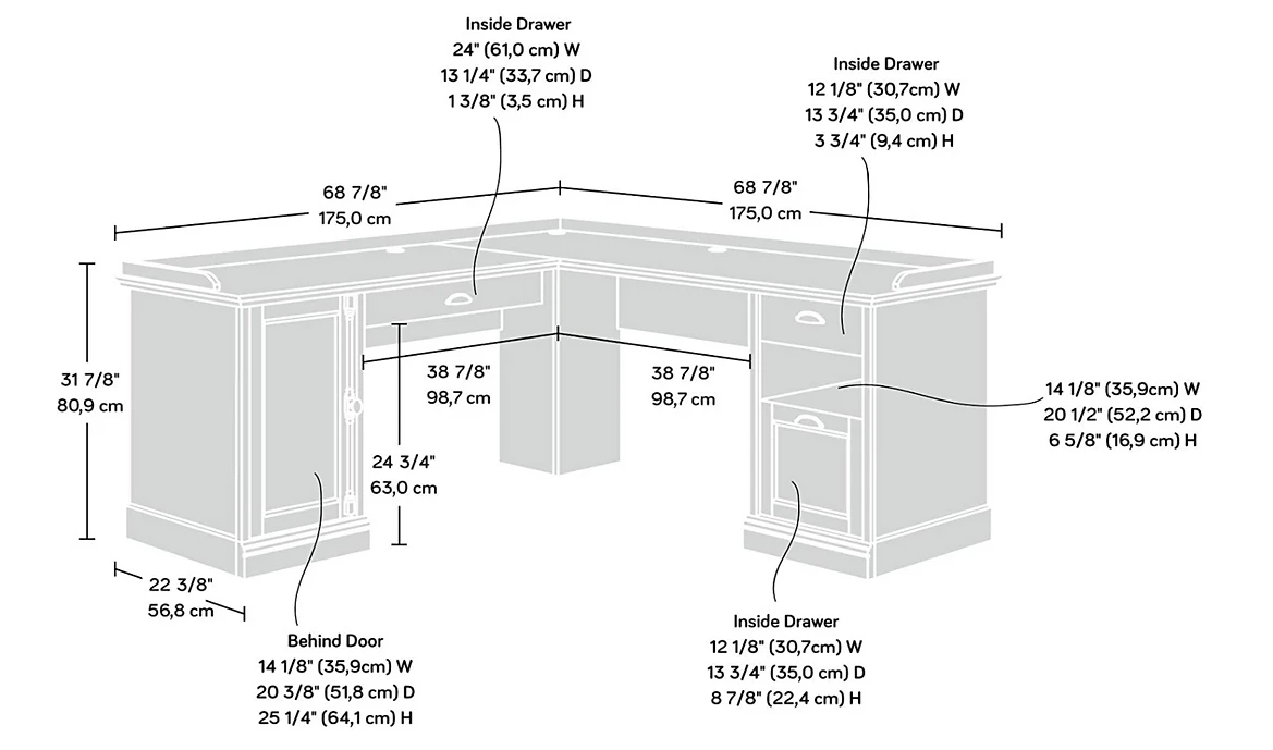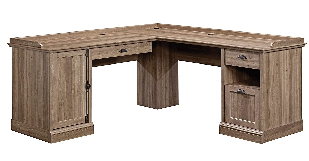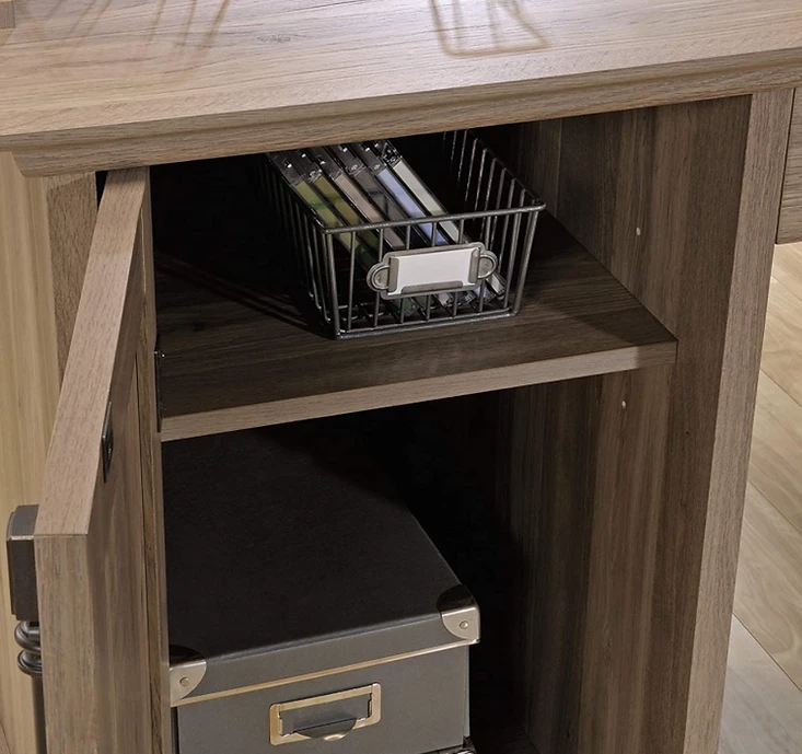 Its time for an office revamp! Do your home office a favor and give it the update it has always needed by adding the simplistic beauty of this L-shaped desk from the Barrister Lane® collection. In need of a little extra work space? Well we’ve got you covered! This L-shaped desk provides you with ample table top space for all your must-have office essentials – laptop, collection of notepads, cup of pens and even an accent lamp too! It features a large pencil drawer that opens and closes on smooth metal runners and can be fastened to either the left or right side of the desk to best fit your needs. It also features a spacious storage drawer for easy access storage of miscellaneous items like folders, your stapler, rubber bands and much more. The file drawer with full extension slides holds letter or legal size hanging files so you can keep all your important documents organized. Behind the framed panel door is a hidden storage area that includes an adjustable shelf and also accommodates a vertical CPU tower. It also features grommet holes so you can keep all your wires neat and out of the way. Finished on all sides in Salt Oak®, this stunning L-shaped desk will have you feeling motivated in the office.