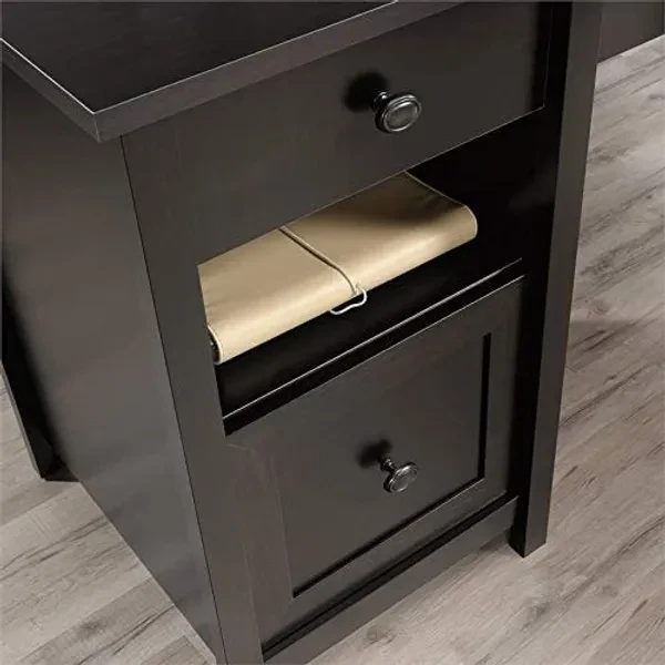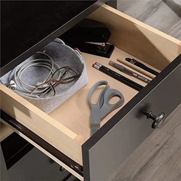 Small drawer for pens, notebooks, and more features metal runners and safety stops.