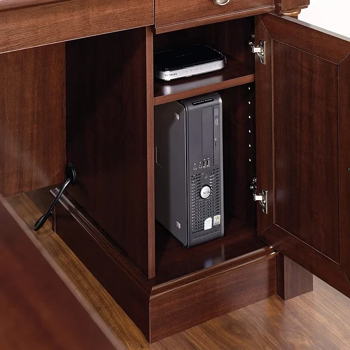The lower file drawer has full extension slides and holds letter or legal size hanging files to help keep you organized! Behind its door is a hidden storage area that includes an adjustable shelf and accommodates a vertical CPU tower. The desk top features grommet holes so you can keep all your cords and wires neat and out of the way.