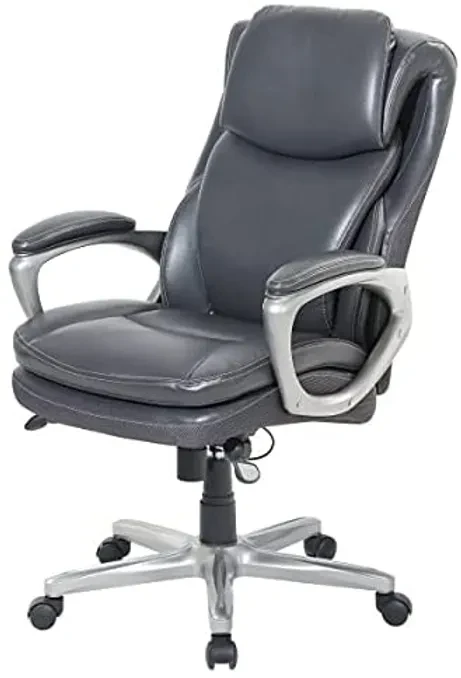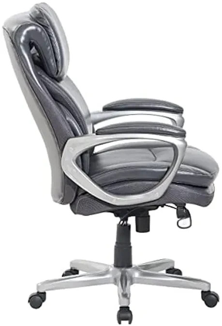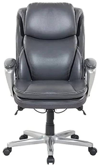 Elevate the appearance of your office with this Serta Smart Layers Arlington AIR executive high-back chair. The dark gray bonded leather material blends with the silver armrests to provide a premium look. A pneumatic handle allows easy customization, while the 5-star swivel base provides stability. This Serta Smart Layers Arlington AIR executive high-back chair features a padded seat and backrest for all-day comfort.