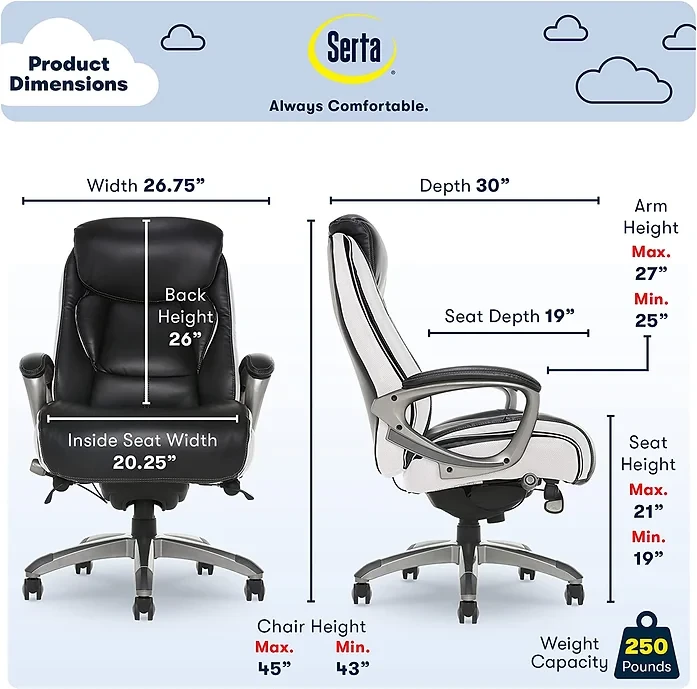 • Find a reason to relax during your workday with the Serta Executive Office Chair from Serta, a brand known for quality and comfort. This ergonomic desk chair has layered body pillows and a pillowed headrest to provide ease while seated for long periods of time. The hand-sculpted arms and smooth bonded leather upholstery have a sleek, professional look that stands out in any work environment. Fully adjustable, this executive office chair allows the user to customize the height and lumbar zone for optimal comfort. This desk chair has a five-layer cushioning system for all day comfort and support. Serta Bonded Leather Office Chair with Smart Layers Tech, 250 lb. Capacity, Black & White