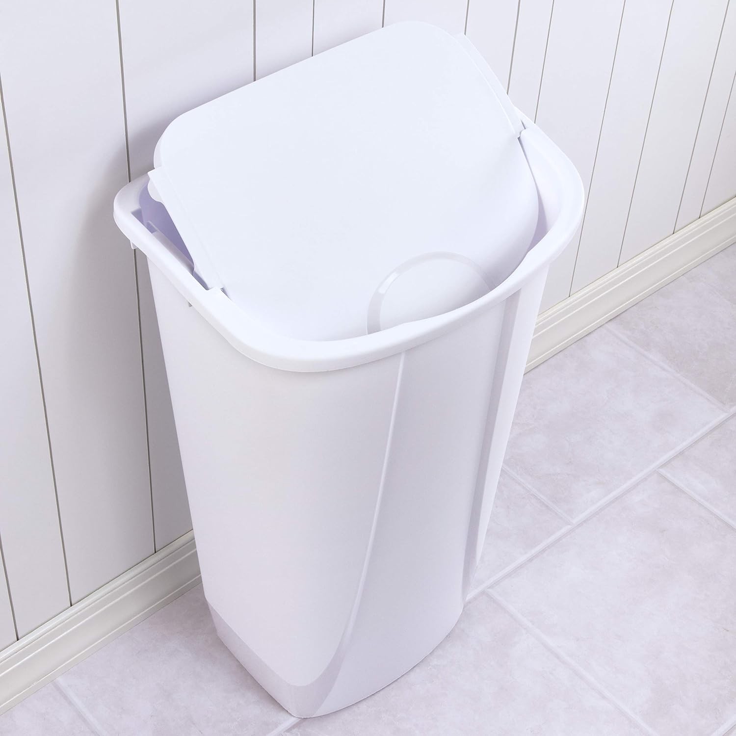Sterilite 10938006 11-Gallon Swing-Top Wastebasket. The 11 Gallon Swing-Top Wastebasket integrates functionality with a simple, elegant appearance. The removable dual action swing-top lid conveniently swings down for quick, hands-free access. The unique design of the lid makes opening the wastebasket easy, and the lid will stay open for disposal of oversized items. The slim profile is ideal for use in the kitchen and is perfect for tight spaces, yet offers a generous 11 gallon capacity. This wastebasket is designed to accommodate standard 13-gallon trash liners without interfering with the swing-top function. 1093 - 11 Gallon Swing-Top Wastebasket.