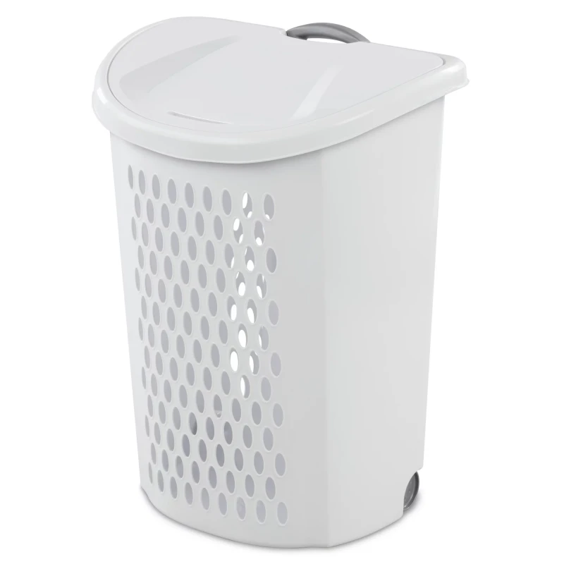 Moving laundry around your home just got easier with the Sterilite Ultra™ Wheeled Hamper. Incorporated into the base of the hamper, the wheels move easily across all smooth surfaces, while the retractable handle provides a secure grip to easily transport clothes. The combination of these two features helps to make trips to the laundry room less of a chore. For situations where the hamper needs to be lifted, integrated handles on each side provide a comfortable gripping surface. The flip-top lid keeps clothes contained and neat, while a large, stylish hole pattern promotes air flow to keep clothes well ventilated. Its durable construction and reinforced rim are designed to hold up to regular day-to-day use. This hamper is ideal for storing dirty clothes and transporting laundry, making it the perfect solution for those living in apartments or dorm rooms. The overall assembled dimensions of this item are 20 1/8" L x 15 3/8" W x 26 3/4" H.