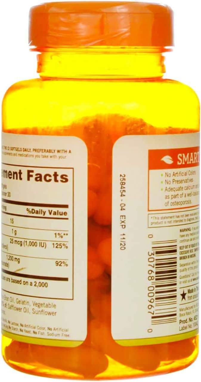 Dedicated to your good health.Dietary SupplementSundown VitActive Ingredients:2 Softgels: Calories 10 (Calories From Fat 10); Total Fat 1 g; Vitamin D (as Cholecalciferol) 200 IU; Calcium (as Calcium Carbonate) 1200 mg (1.2 g); Soybean Oil; Gelatin; Glycerin; Soy Lecithin; Titanium Dioxide ColorFor adults, take two (2) softgels daily, preferably with a meal. As a reminder, discuss the supplements and medications you take with your health care providers.Uses:Calcium is the primary mineral responsible for strong bones.* The body also uses Calcium for proper muscle contraction and nerve function.* Vitamin D assists in Calcium absorption and maintaining a healthy immune system.* Because the body cannot produce Calcium, a balanced diet, regular exercise, healthy lifestyle choices and adequate intake of Calcium and Vitamin D can play a role in maintaining optimal bone health.* Liquid-filled. Readily absorbed.If you are pregnant, nursing or taking any medications, consult your doctor before use. Discontinue use and consult your doctor if any adverse reactions occur. KEEP OUT OF REACH OF CHILDREN. *This product is not intended to diagnose, treat, cure or prevent any disease.