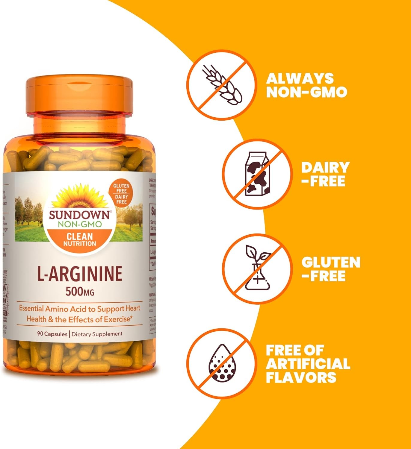 Sundown L-Arginine 500mg supports heart health and the effects of exercise. (2) L-Arginine plays an important role in nutrition and is one of the most important amino acids for supporting coronary blood flow and vascular function. (2) It is often used as a supplement by athletes. For adults, take two (2) L-Arginine capsules three (3) times daily, preferably with meals. At Sundown, we believe in living clean (1)…and being transparent. That’s why you won’t find genetically modified ingredients, gluten, dairy, or artificial flavors in any of our products. Choose Sundown for premium clean vitamins, without the premium price. (1) Contains 90 capsules.