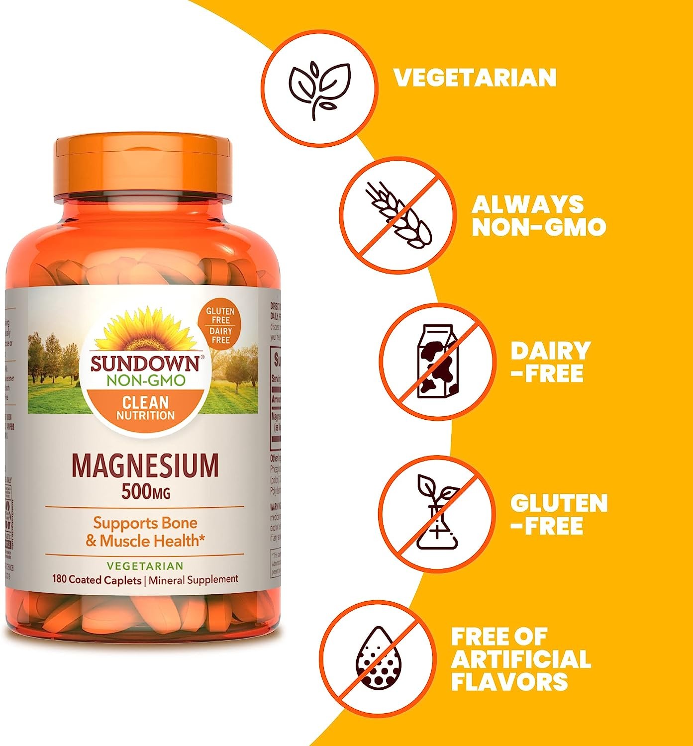 Sundown Magnesium 500mg caplets are a great way to add more Magnesium to your diet. This mineral is critical to over 300 important chemical reactions in your body. Taking a Magnesium supplement may help support energy metabolism, bone, and muscle health, as well as help alleviate occasional stress. (2) Sundown Magnesium also helps regulate the transport and absorption of Calcium in your body, which helps support strong bones, teeth and joints. (2) Magnesium is found in foods such as spinach, black beans, potatoes, peanuts, brown rice, and chicken breast. For adults, take one (1) caplet daily, preferably with a meal. At Sundown, we believe in living clean (1)…and being transparent. That’s why you won’t find genetically modified ingredients, gluten, dairy, or artificial flavors in any of our products. Choose Sundown for premium clean vitamins, without the premium price. (1) Contains 180 coated caplets.