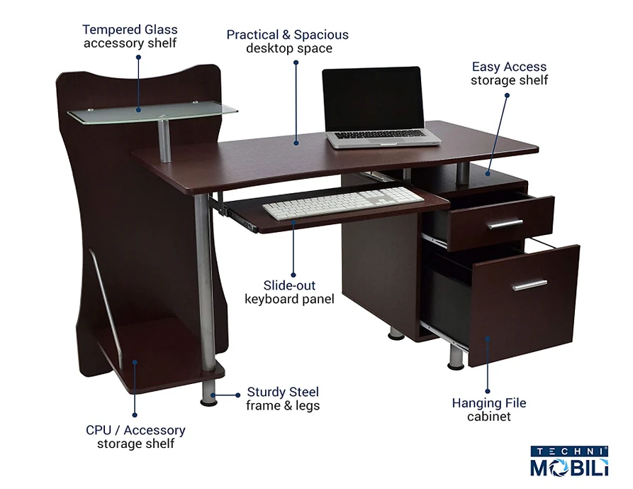 This Techni Mobili Computer Desk adds convenience and style to your work space. This desk has plenty of room for your computer, printer, hanging files, and much more. With multiple compartments for storage and space to display decorative items, this computer desk will solve all your organizational issues. The Techni Mobili desk has MDF wood construction in Chocolate color, with a PVC laminated surface providing strength and durability. Color: Chocolate.