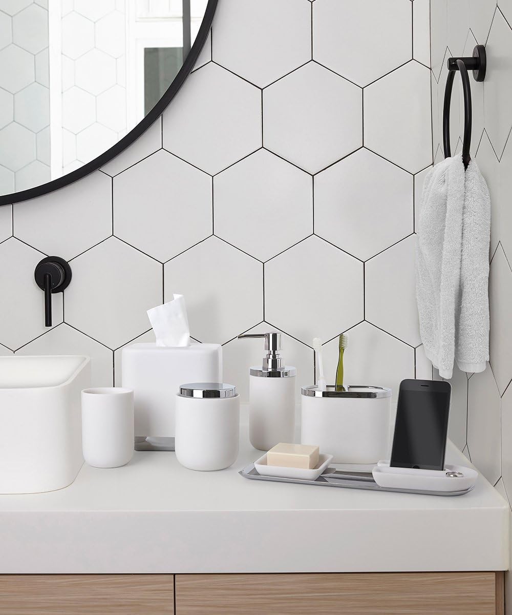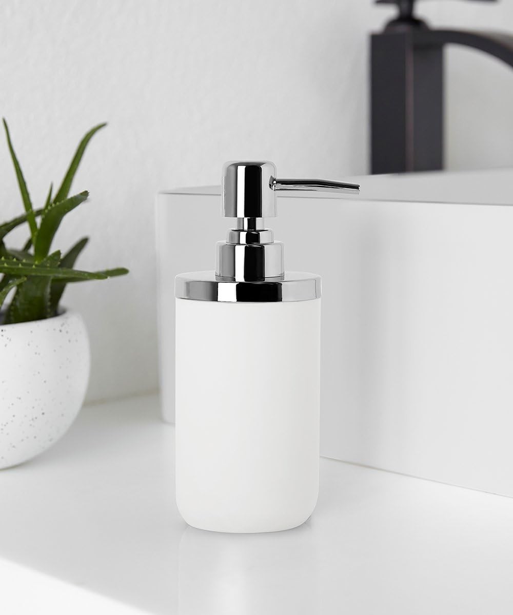A modern hand soap pump for the bathroom, part of the Junip collection, one of our two apothecary-inspired collaborations with Gensler, the world's leading collaborative design firm. The pieces in the Junip collection have the weighted look and feel of traditional apothecary bottles, but with modern lines and finishes. Featuring warm and inviting rounded lines, chrome accents and an eye-catching matte finish. The pieces in the Junip collection are refined, yet comfortably casual, with shapes and proportions that aren't perfectly matched, but rather coordinated to be complementary. Holds 12 oz (380 mL). Measures 2.75” (7 cm) in diameter.