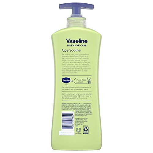 Vaseline Intensive Care Aloe Soothe Lotion is clinically proven to moisturize deeply to soothe dry skin with the first application, keeping skin healed for 3 weeks*. The formulation uses glycerin, which helps the moisturizing properties, like micro-droplets of Vaseline Jelly, to bind deep into skin, beyond the surface. Vaseline Intensive Care Aloe Soothe Lotion leaves behind a soothing scent and a non-greasy finish, making it an ideal choice for year-round healing from the sun, wind, and many other environmental factors.