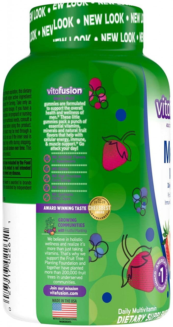 vitafusion Men's Multivitamin provides a complete multivitamin specially formulated to support the health needs of men. Each delicious two-gummy serving combines essential vitamins and minerals with natural fruit flavors to provide a great-tasting and convenient alternative to traditional, hard-to-swallow pills, for everyday nutrition. At vitafusion, we believe taste and nutrition can be fused together to deliver the best vitamin experience, ensuring it’s an easy and delicious part of your day. For over 12 years, we’ve been helping people to live happy and healthy lives with our gummy vitamins and supplements. Vitafusion is the only gummy vitamin brand with products that have been awarded the ChefsBest Excellence award for taste. [2] Anything is possible when great nutrition is your foundation. Take a fruitful step toward a healthier, happier world with America’s #1 gummy vitamin brand. Vitamin Better! [1] These statements have not been evaluated by the Food and Drug Administration. This product is not intended to diagnose, treat, cure or prevent any disease. [2] The ChefsBest Excellence Award is awarded to brands that surpass quality standards established by independent professional chefs.