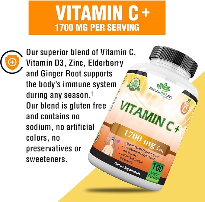 Vitamin C 1,700 MG with Vitamin D3, Zinc, Elderberry, Ginger Root - Maximum Strength Multi System Immune Support- 100 Veggie Capsules