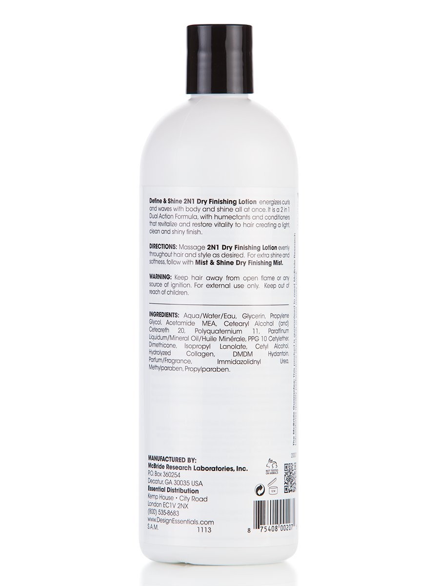 Revitalizes and refreshes curls and waves imparting body and shine. Moisturizes and softens hair. (permanent waves, textured styles, natural and dry curls). Prevents breakage and increases elasticity. Conditions and detangles hair. Lubricates hair shaft without build up. WAVE BY DESIGN® DEFINE & SHINE 2-N-1 DRY FINISHING LOTION is a daily moisturizer that softens and defines curls. Revitalizes and refreshes curls and waves imparting body and shine. Moisturizes and softens hair. (permanent waves, textured styles, natural and dry curls) Prevents breakage and increases elasticity. Conditions and detangles hair. Lubricates hair shaft without build up. Size: 16 fl oz.