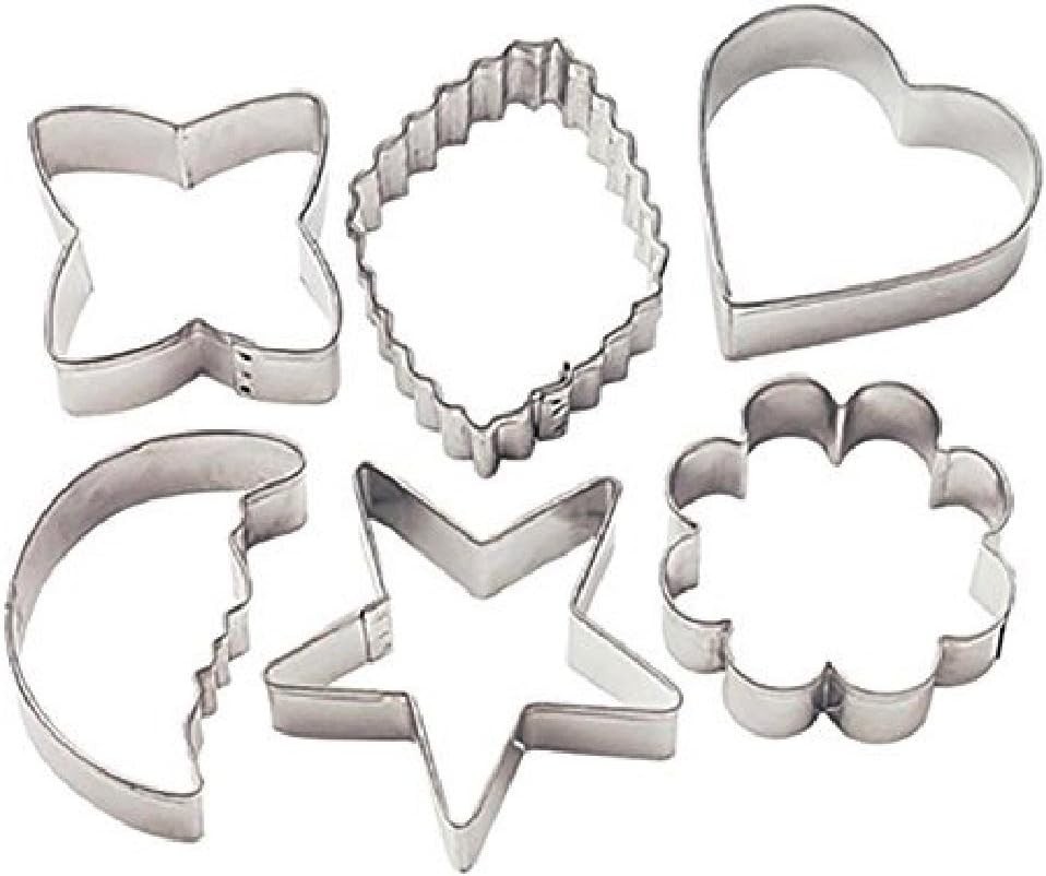 A cookie shape for every occasion. Includes geometric, crinkle diamond, flower, half moon, heart and star cutters, each approximately 3 inches in size.