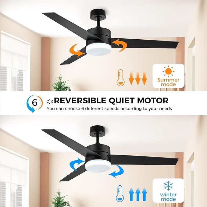 QUIET & REVERSIBLE: The powerful ceiling fan operates on 6 forward and reverse speeds (easy to adjust with the included handheld remote). Change the direction from downdraft mode during the summer to updraft mode during the winter.