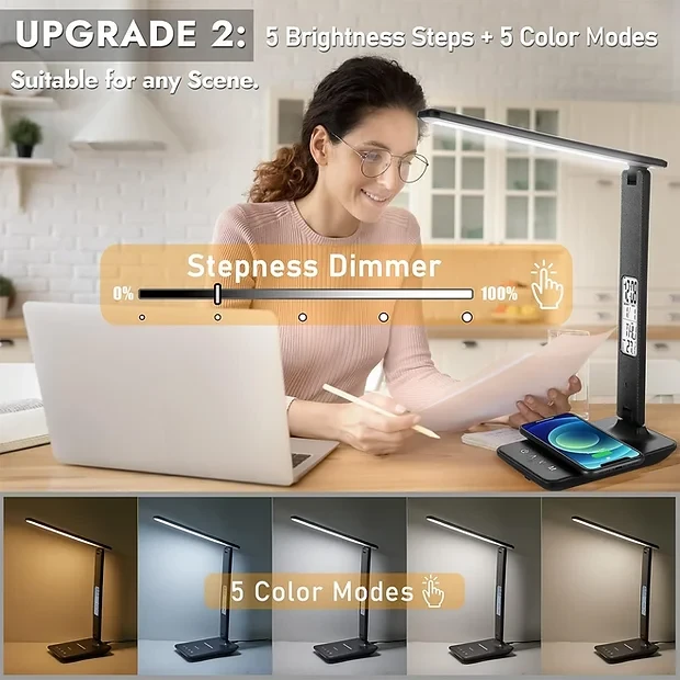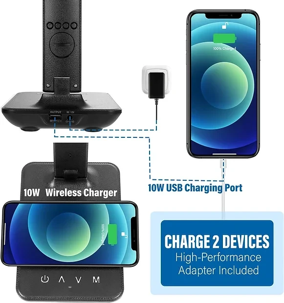 POWERFUL CHARGING: This is a multi-functional desk lamp with USB charging port (10W) and wireless charger (10W), which means you can charge two devices and use the desk lamp to work at the same time.