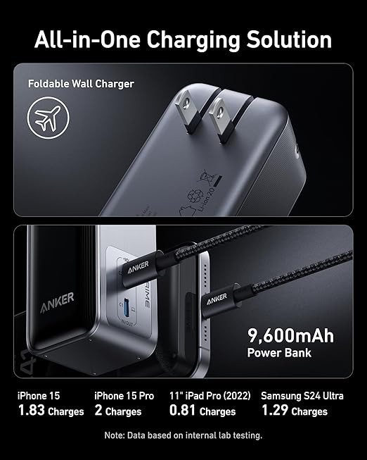 Anker Prime Power Bank, 9,600mAh Battery Pack with 65W Output, Built-in AC Plug, Supports PD 3.0 and PPS, 30W Fast Recharging, Sleek Portable Charger for MacBook Pro, iPhone 15 Series, Galaxy, iPad