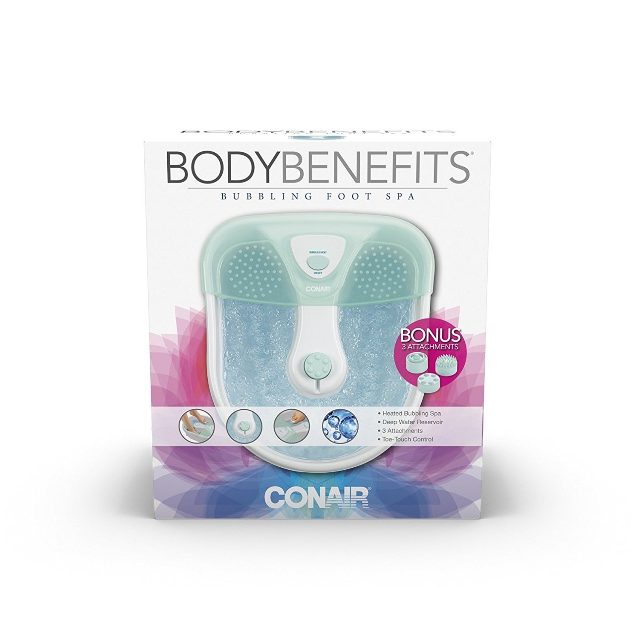 Wash away the day's cares with the Conair Foot Spa with Heath, Bubbles and 3 Attachments. One touchpad control button makes it easy to choose heat and just enough bubbles, while three pedicure attachments and two bubble strips provide a pampering touch. The attractive design makes it a perfect fit with any home decor setup.