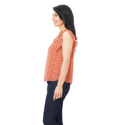 Feel pretty and cool in this sleeveless V-neck blouse with ruffles on the neck and shoulders. It's feminine, and stylish and pairs well with casual pants, a skirt, and even dark jeans. It comes in pastel shades with a pretty floral print.
