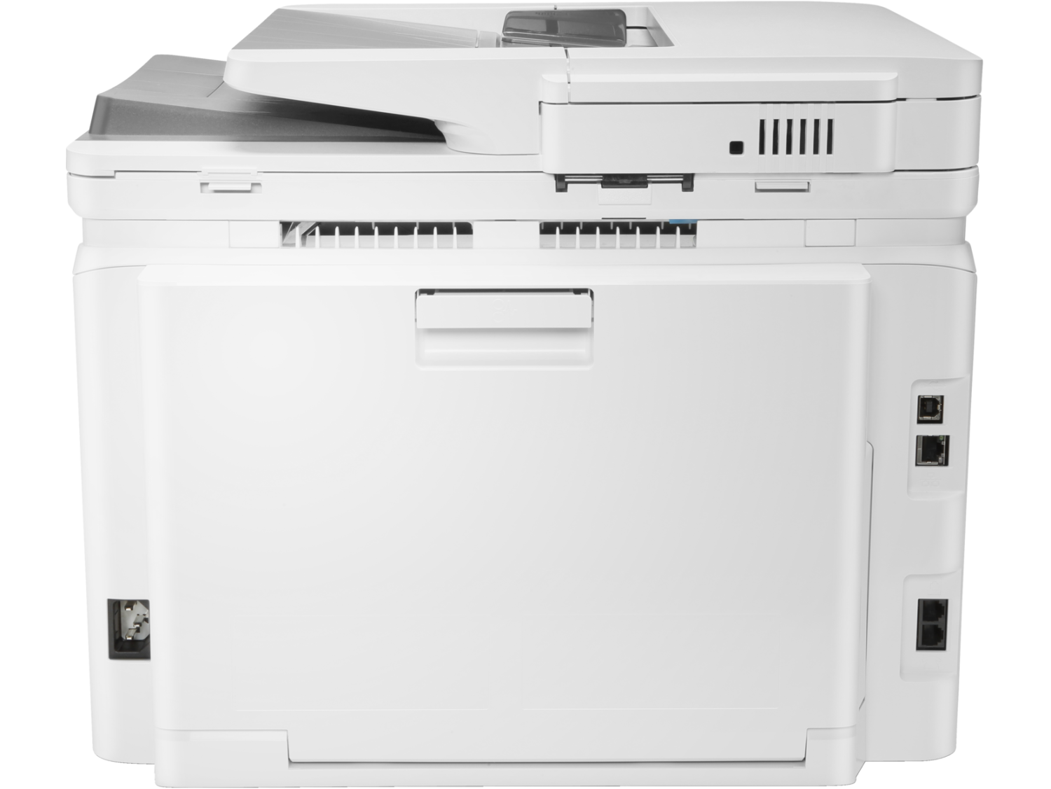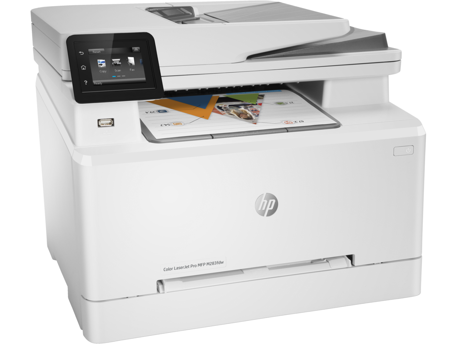 HP Color LaserJet Pro MFP M283fdw; HP LaserJet Black Introductory toner cartridge (~800 page yield); HP LaserJet Cyan Introductory toner cartridge; HP LaserJet Magenta Introductory toner cartridge; HP LaserJet Yellow Introductory toner cartridge (~700 color composite C/Y/M page yield) Installation guide; Power cord; USB cable; Phone Cord