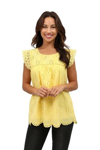 Flattering and versatile sleeveless crochet and lace trim eyelet top. The lace trim on eyelet fabric provides a feminine look to the comfortable crew neck top. The front and back panels are lined.