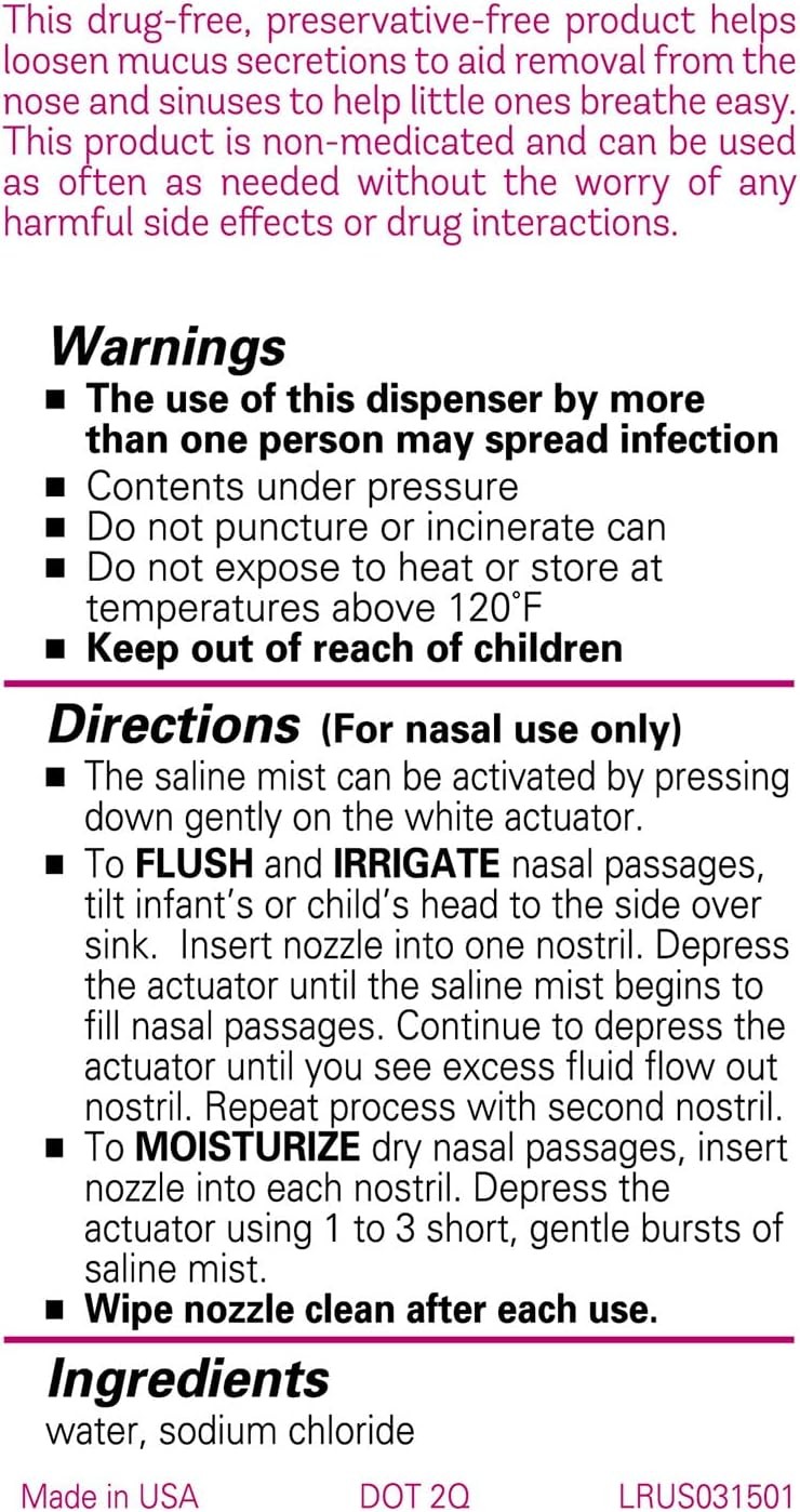 Little Remedies Sterile Saline Mist is a drug free, preservative free product which helps loosen mucus secretions to aid removal from the nose and help little ones breathe easy. This product is non medicated and can be used as often as needed without the worry of any harmful side effects or drug interactions. As a parent, it’s the little things that matter. Your baby’s little giggles, little steps, and little sniffles. Being there with a little hug and a little song. Loving touches and attention to detail go into everything you do. Little things matter to us too. Little Remedies designs safe and reliable solutions just for babies. We pay attention to little details, like ensuring our products are free from parabens, artificial flavors, and dyes. To help your baby stay happy and healthy, we make sure they have everything they need. And nothing they don't.