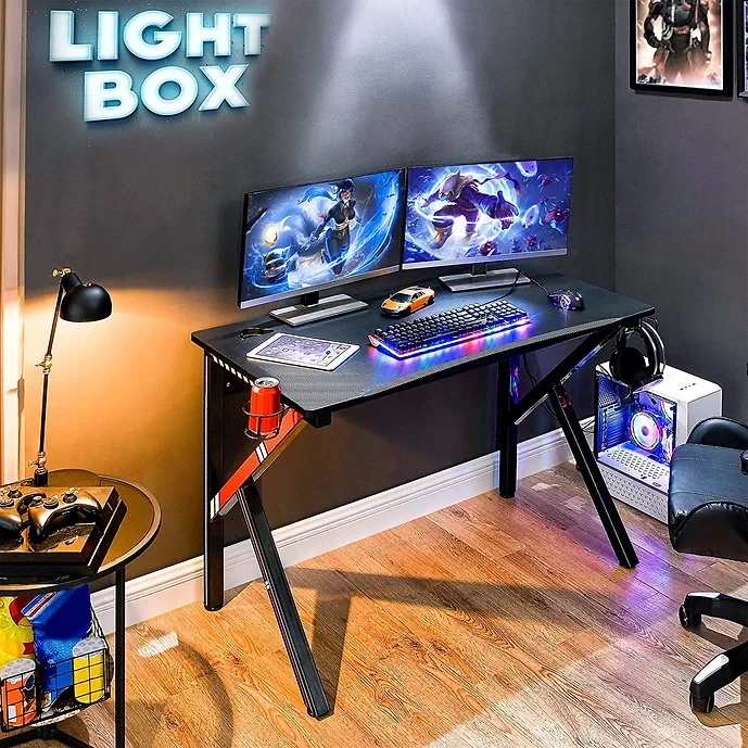 • Stable & Rock Solid K-shaped Frame Construction: Constructed by high-quality carbon fiber top and durable metal frame legs, the gaming desk can bear large weight, even up to 110 lbs. K shaped desk legs design provides more support and ensures stability and durability. Adjustable leg pads ensure the gaming computer desk keeps a sturdy construction even on uneven ground without wobbling.