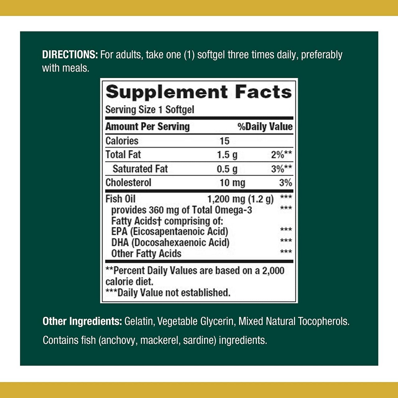 Nature's Bounty Fish Oil 1200 mg contains EPA and DHA, two Omega-3 fatty acids that help support and maintain the health of your cardiovascular system.* Omega-3 fatty acids are considered “good” fats important for cellular, heart and metabolic health and help maintain triglyceride levels already within a normal range.