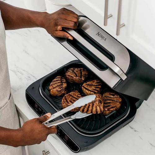 This Ninja Foodi XL 5-in-1 indoor kitchen appliance grills, roasts, bakes, dehydrates, and air crisps using a 4-quart crisper basket. Provides heat at 500 degrees Fahrenheit for rapid cyclonic air circulation and surround searing. Variable fan speed and digital display Grill. Control settings at low, medium, high, and max from 105 to 500 degrees Fahrenheit. Temperature-controlled grill gates, splatter, shields, and cool-air zone reduce smoke and create char-grilled marks.