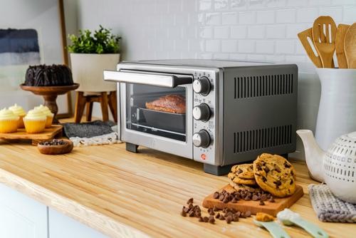 The Oster® Compact Countertop Oven with Air Fryer is a 4-slice, stainless steel compact countertop oven that combines 4 appliances in one: a convection oven, an air fryer, a toaster, and a broiler. Includes a removable crumb tray, a baking pan, and a metal rack that doubles as an air fry tray. Fits a 9'' pizza or up to 4 slices of bread, 3 rack positions, a 60-minute timer, and an adjustable broil feature that allows the oven to broil at any temperature.