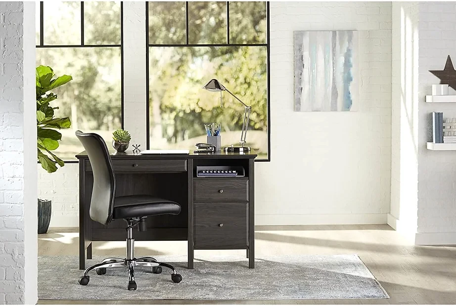 Showcase sophisticated style with this Realspace Chase writing desk. A simple silhouette pairs with contemporary drawer pulls to create a professional look, and the open cubby keeps your tablet or phone within easy reach. The file, box and pencil drawers let you sort paperwork and store supplies for quick access as you work. This Realspace Chase writing desk features a large desktop to accommodate your laptop and peripherals. Open cubby adds convenient shelf space. Pencil, box and file drawers provide storage for supplies and paperwork. Straight legs and clean lines offer modern appeal. Assembly required. Finished in coastal gray. Tested to meet ANSI/BIFMA Performance Standards - Manufacturer testing has been conducted on this product to meet specific performance requirements and safety standards set forth by the American National Standards Institute (ANSI) and the Business and Institutional Furniture Manufacturers. This product is heavy and/or oversized and may need more than one person to handle. Interested in in-home assembly? Please call our certified and insured professional assemblers 866-388-4350 today!