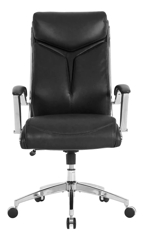Working from home and writing your novel are that much more comfortable with the right high-back chair at your desk. Crafted for style and function, this Realspace Verismo bonded leather high-back chair minimizes body strains during lengthy work sessions and makes relaxing after a job well done easier with built-in lumbar support, a waterfall seat cushion and multiple adjustments. Leather office chairs provide an upscale look that complements your sophisticated taste.